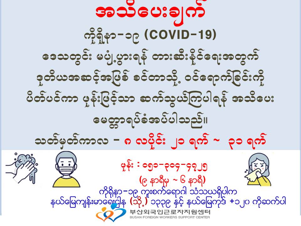 ကိုရိုနာ ၁၉ ကူးစက္ေရာဂါ ကာကြယ္တားဆီးေရးအတြက္ ဒုတိယအဆင့္အျဖစ္ စင္တာသိုု႕ ျပင္ပလူ ဝင္ေရာက္ခြင့္ကို ၈ လပိုင္း ၂၁ ရက္မွ ၃၁ ရက္အထိ ကန္႕သတ္ထားပါသျဖင့္ အလုပ္သမားေရးရာ တိုင္ပင္လိုပါက ဖုန္းျဖင့္ဆက္သြယ္ ၾကပါရန္ ေလးစားစြာ အသိေပးေမတၱာရပ္ခံအပ္ပါသည္ ။