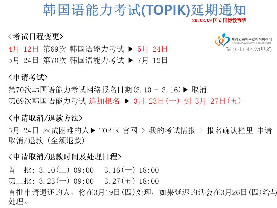 韩国语能力考试(TOPIK)延期通知