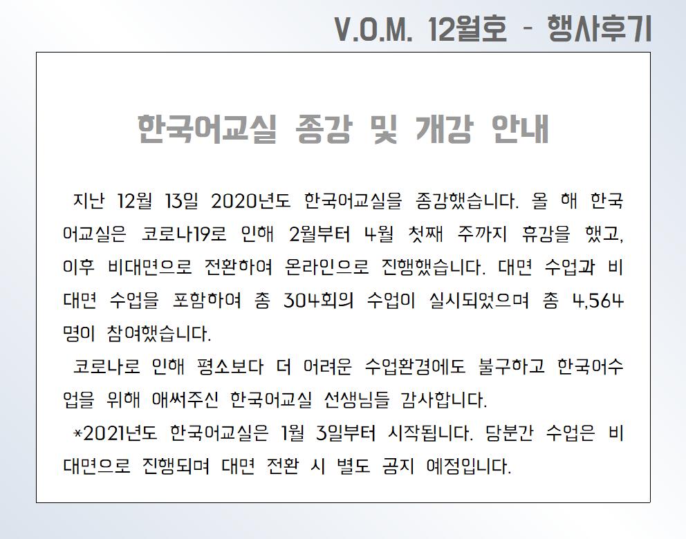 2020년 12월 – 한국어교실 종강 및 개강 안내